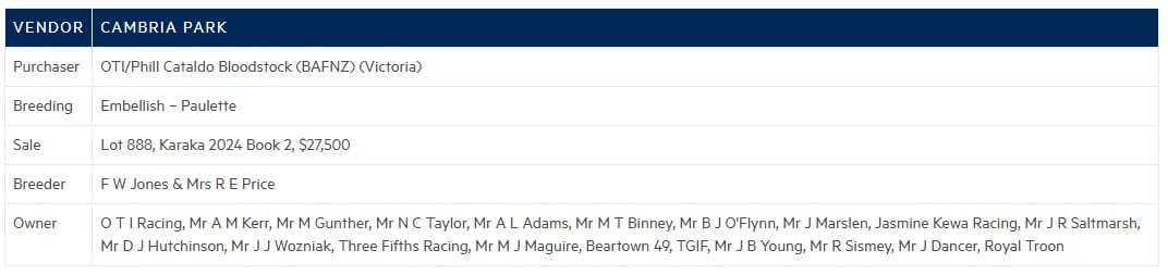 Kazaru was offered by Cambria Park in Book 2 of Karaka 2024 and was bought by OTI in partnership with Phill Cataldo Bloodstock. The emerging filly has now had seven starts for two wins, two placings and A$153,150 in stakes.
