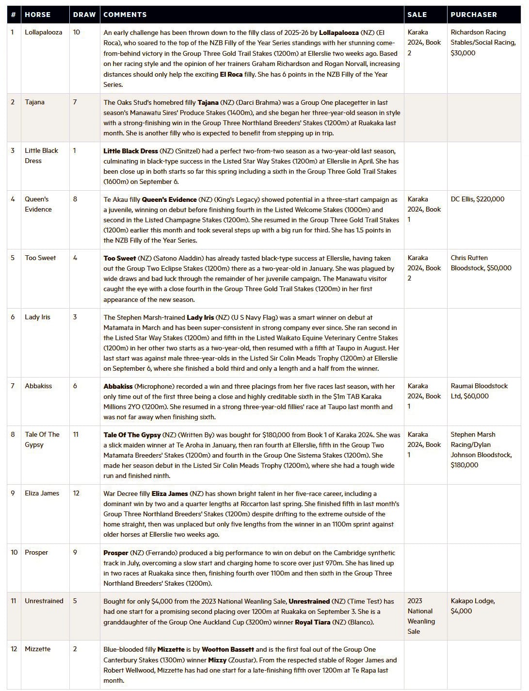 The line-up is headed by Lollapalooza (NZ) (El Roca), who tops the Filly of the Year Series table with 6 points after scoring a stunning come-from-nowhere win in the Group Three Gold Trail Stakes (1200m) two weeks ago.