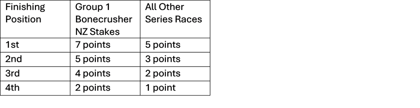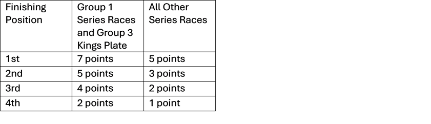 Points will be allocated to the first four placegetters of each race in the respective Series, with a bonus pool of $500,000 being shared amongst the owners of the three highest point scoring horses at the conclusion of each Series. The top three points earners of each Series will receive $300,000 for first, $150,000 for second and $50,000 for third (with the trainer of the first-place getter receiving 10% of the bonus won).
